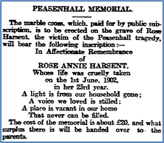 She was buried on 5th June, 1902, in Peasenhall. Later a public subscription was raised to pay for the stonework and a memorial was erected to her.