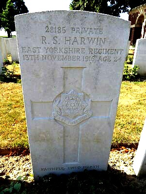 Supplementary Notes: | “HARWIN, Pte. R. S., 28185. 12th Bn. East Yorkshire Regt. 13th Nov., 1916. Age 24. Son of George and Emma Harwin, of 3, Scargells Rd., High St., March, Cambs. IV. Q. 5.” - from CWGC Grave Registration |