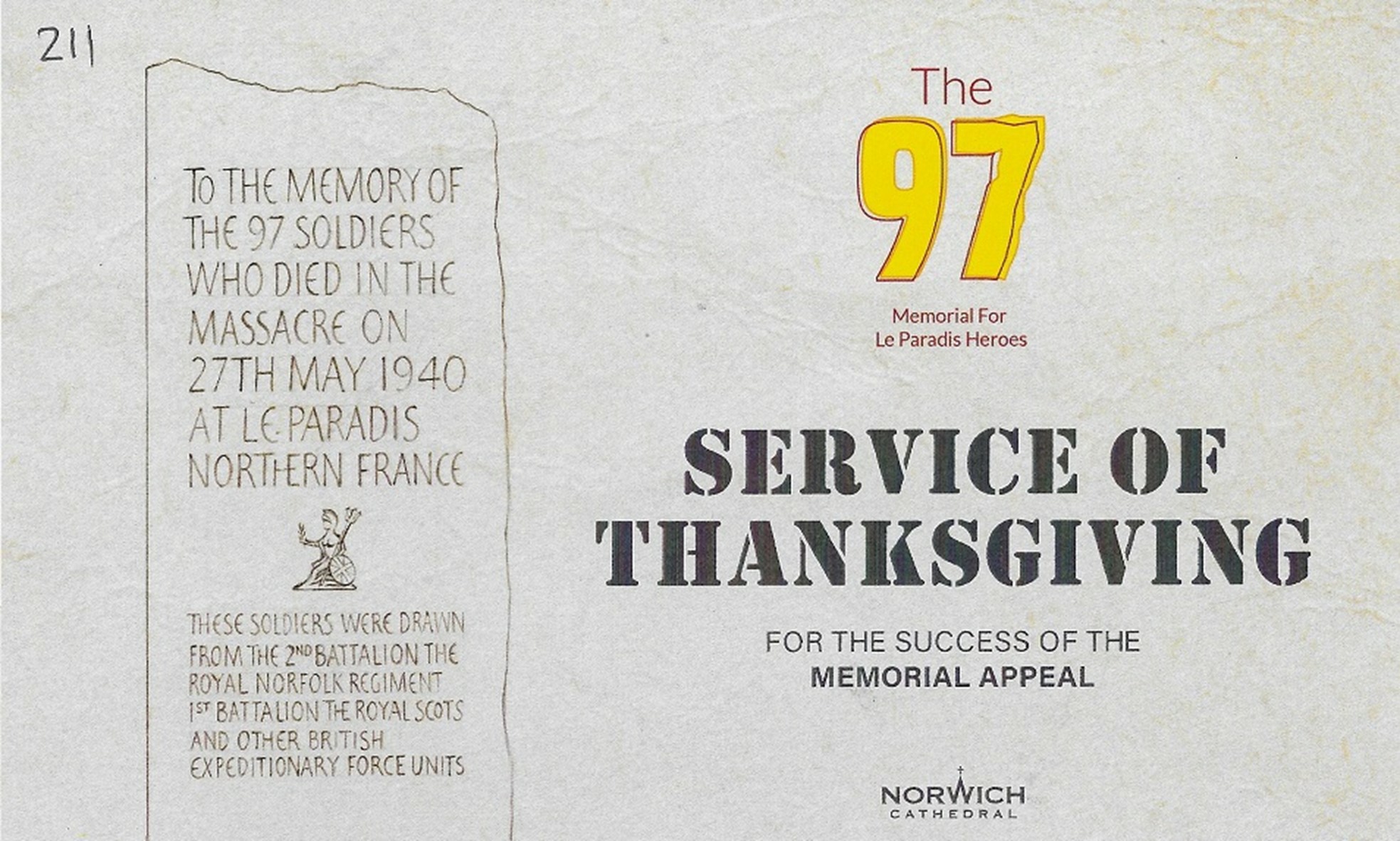 24th April 2022, saw a service at Norwich Cathedral to the memory of the 97 Service men murdered at a farm in the village of Le Paradis, Normandy, France in 1940.