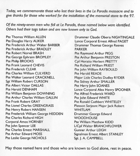 Thanks to the Le Paradis Commemoration Group Memorial Appeal and Diss Family History Group for the invitation to the Service.