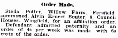 | Norfolk and Suffolk Journal and Diss Express Friday 12th May 1939 Page 5 Order Made Stella Potter, Willow Farm, Fersfield summoned Alvin Ernest Souter, 8, Council Houses, Wingfield, for an affiliation order. Defendant admitted paternity and an order of 4s per week was made with 6s costs of the order. |