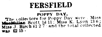 | Norfolk and Suffolk Journal and Diss Express Friday 24th November 1939 FERSFIELD -------- POPPY DAY. The collectors for Poppy Day were : Miss MacMillan Scott 18/11 : Miss K. Lyon 13/6 : Miss J. Birch £1/2/7 : and the total collected was £2/15/-. |