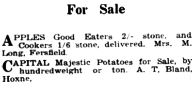 | Diss Express Friday 29th December 1939 For Sale APPLES Good Eaters 2/- stone, and Cookers 1/6 stone, delivered. Mrs. M. Long, Fersfield. |