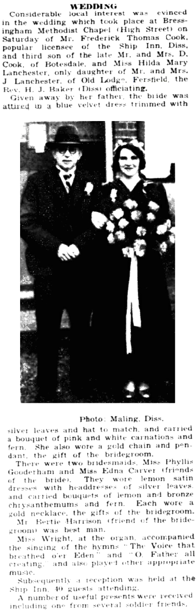 | Norfolk and Suffolk Journal and Diss Express Friday 17th November 1939 WEDDING. Considerable local interest was evinced in the wedding which took place at Bressingham Methodist Chapel (High Street) on Saturday of Mr. Frederick Thomas Cook, popular licensee of the Ship Inn, Diss, and third son of the late Mr. and Mrs. D. Cook, of Botesdale, and Miss Hilda Mary Lanchester, of Old Lodge, Fersfield, the Rev. H. J. Baker (Diss) officiating. Given away by her father, the bride was attired in a blue velvet dress trimmed with silver leaves and hat to match, and carried a bouquet of pink and white carnations and fern. She also wore a gold chain and pendant, the gift of the bridegroom. There were two bridesmaids, Miss Phyllis Gooderham and Miss Edna Carver (friends of the bride). They wore lemon satin dresses with headdresses of silver leaves, and carried bouquets of lemon and bronze chrysanthemums and fern. Each wore a gold necklace, the gifts of the bridegroom. Mr. Bertie Harrison (friend of the bridegroom) was best man. Miss Wright, at the organ, accompanied the singing of the hymns “The Voice that breathed o’er Eden” and “O, Father all creating”, and also played other appropriate music. Subsequently a reception was held at the Ship Inn, 40 guests attending. A number of useful presents were received, including one from several soldier friends. |