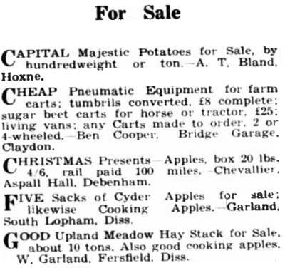 | Norfolk and Suffolk Journal and Diss Express Friday 8th December 1939 For Sale ....... GOOD Upland Meadow Hay Stack for Sale, about 10 tons. Also good cooking apples. W. Garland, Fersfield, Diss. |