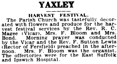 | Norfolk and Suffolk Journal and Diss Express Friday 13th October 1939 YAXLEY HARVEST FESTIVAL The Parish Church was tastefully decorated with flowers and produce fcor the harvest festival services by the Rev. R. C. Magee (Vicar), Mrs. F. Bloom and Mrs. Bond. Morning prayer was conducted by the Vicar and the Rev. F. Sutton Lewis (Rector of Fersfield) preached in the afternoon. Mrs. F. Bloom was the organist. The offertories were for the East Suffolk and Ipswich Hospital. |
