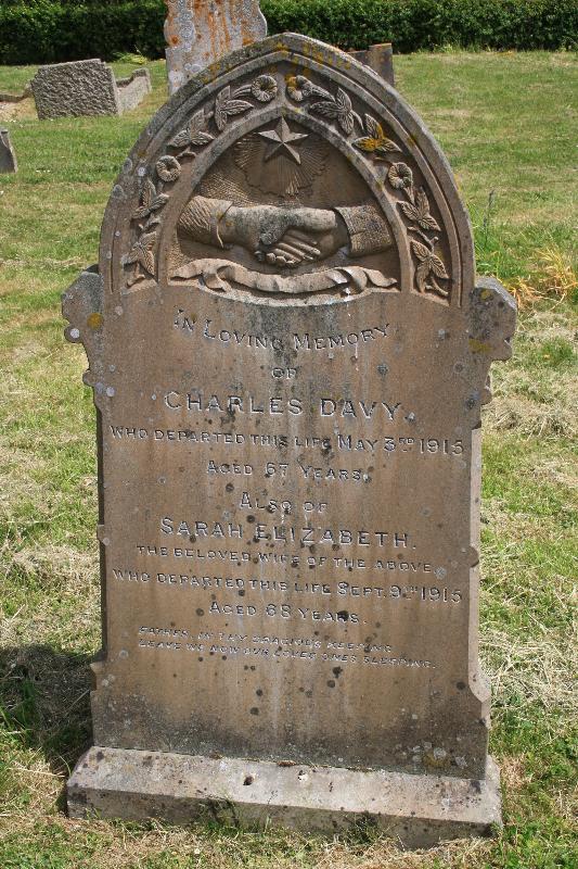 IN LOVING MEMORY • OF • CHARLES DAVY • WHO DEPARTED THIS LIFE MAY 3RD 1915 • AGED 67 YEARS • ALSO OF • SARAH ELIZABETH •BELOVED WIFE OF THE ABOVE • WHO DEPARTED THIS LIFE SEP. 9TH 1915 • AGED 68 YEARS • FATHER IN THY GRACIOUS KEEPING • LEAVE WE NOW OUR LOVED ONES SLEEPING
