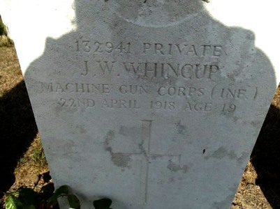 | Supplementary Notes: | “WHINCUP, Pte. John William, 132941. 4th Bn. Machine Gun Corps (Inf.). Killed in action 22nd April 1918. Age 19. Son of John Whincup and Susan Whincup, of Red House, Forncett St. Mary, Norwich, Norfolk. III. C. 17.” from CWGC Grave Registration |